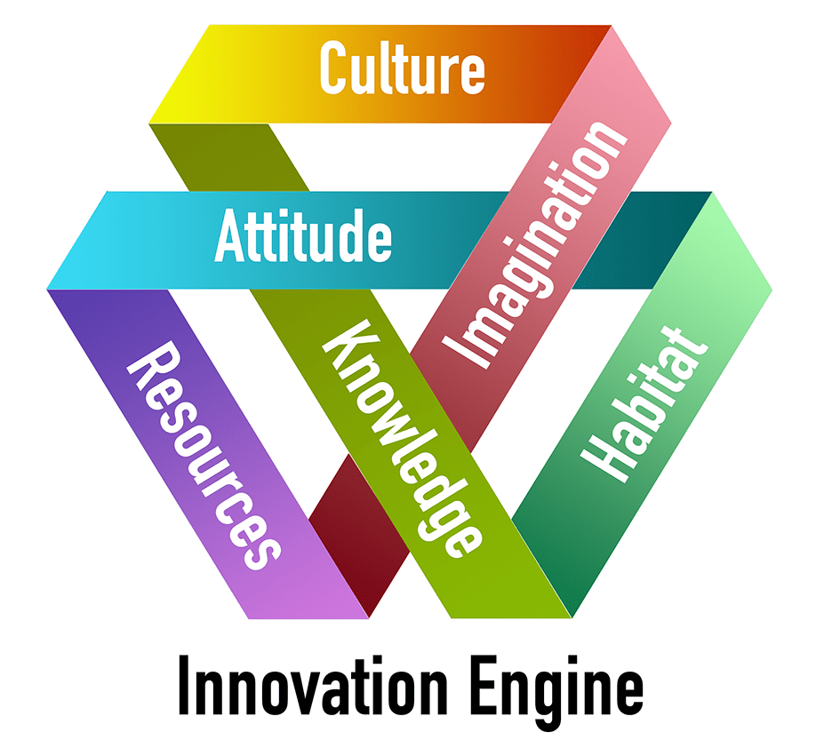 Tina Seelig with Stanford’s Innovation Lab envisions the engine of innovation as a series of three internal factors (imagination, knowledge, and attitude) and three corresponding external factors (habitat, resources, and culture). Innovation requires personal imagination of what can be, knowledge of how to attain it, and an attitude of personal efficacy to reach it, but also requires a supportive environment (habitat), sufficient resources, and a surrounding culture that rewards innovation.