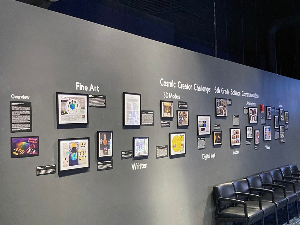 The student descriptions were printed out in white letters on a black background on cardstock and the winning projects printed out and placed in frames. I also learned how to use a Cricut machine to create the lettering with self-adhesive vinyl letters. All of this was placed on a wall on our third floor near the restrooms where people can readily see it to help drum up excitement for 2024’s Cosmic Creator Challenge.
