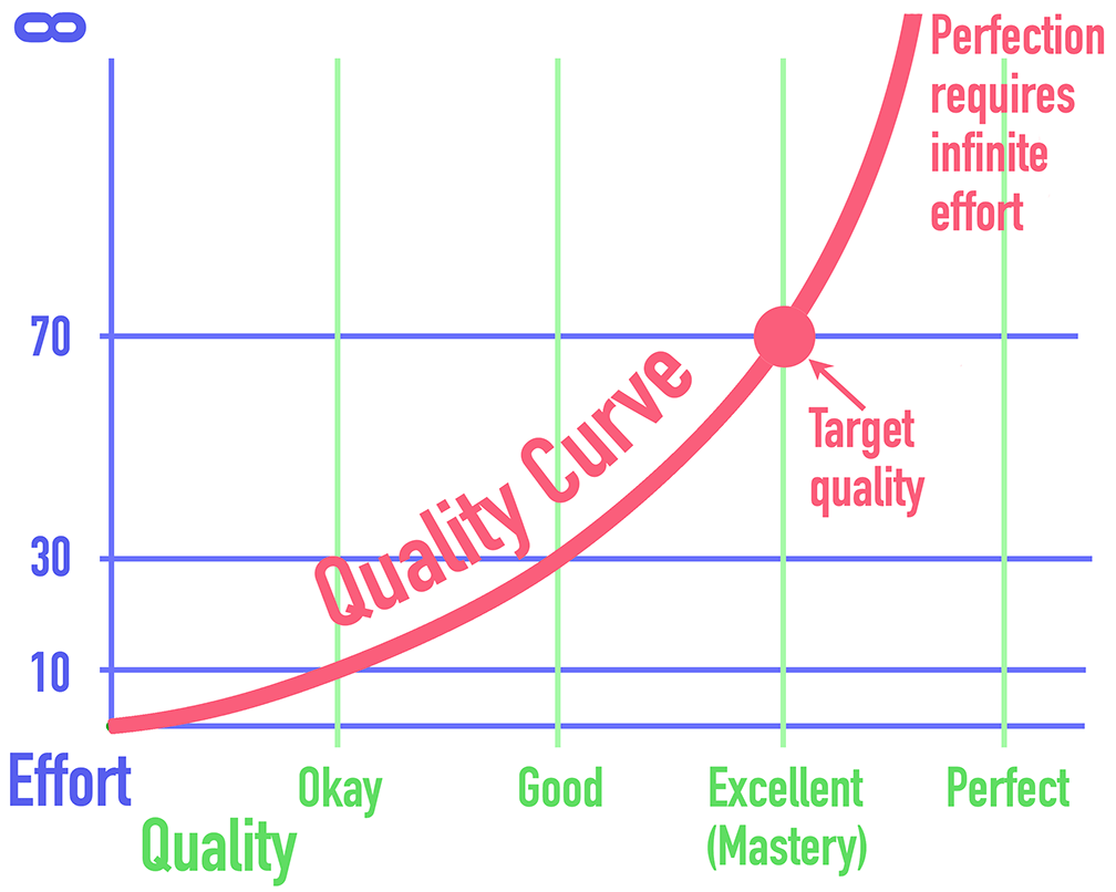 Students have to learn the quality curve as shown here. The relationship between the level of quality of their projects and the amount of effort it takes to reach those levels is not linear. Doubling the effort doesn’t double the quality. It is more of an exponential curve or hyperbola. It takes a certain amount of effort, let’s say 1.0 effort units to get a project to passable, or OK quality (let’s say a C grade). To go from OK to Good takes an additional 4.0 effort units, and from Good to Excellent takes 9.0 more units. The next quality level would be perfection, but the curve is asymptotic to perfection and it would take an infinite amount of effort to reach it. In what is sometimes called the 80-20 rule, it takes 80% of the total time of a project to reach the final 20% of excellence to make the project stand out. In the professional world, good is not good enough.