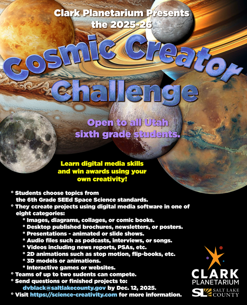 Invitation to Join the Cosmic Creator Challenge: This is an invitation for all Utah 6th grade teachers to join the Challenge in pdf format. Please download and distribute to all the 6th grade teachers at your school: