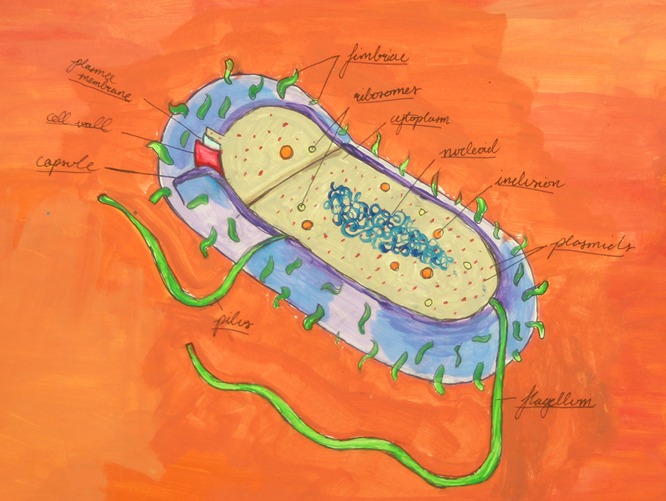 The example shown here is a physical painting instead of a digital diagram, but conveys the basic idea. Instead of just names, the labels should provide further information and go into more detail to demonstrate mastery of the parts of a bacterial cell. The labels should be done using the type tool in Photopea or Inkscape instead of being drawn by hand.