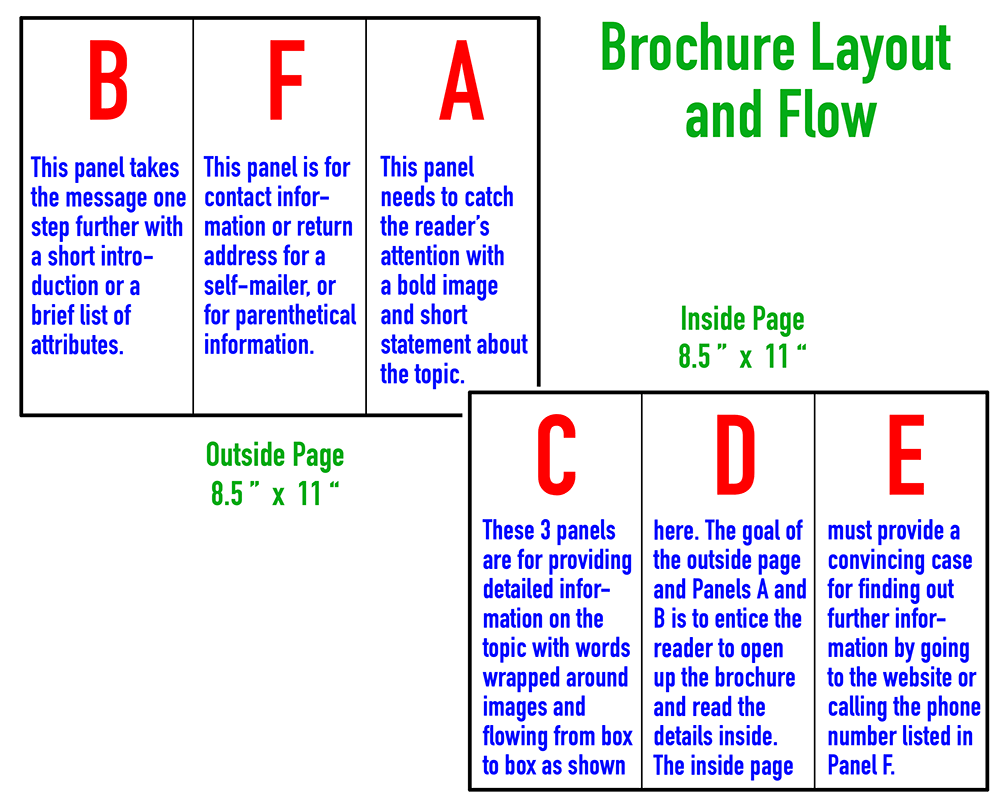 When folded up, the first panel seen is Panel A, the brochure cover or the right side panel on the first or outside page. It should include an eye-catching image and a brief title to grab a person’s attention enough that they will pick up the brochure. The next panel is labeled B and is on the left side of the first page and is what’s seen when the cover panel is opened. It should develop the idea further with a short list of attributes or reasons for buying that product or traveling to that location. Then the reader will open up the next flap and see all three of the inside panels (C, D, and E) at once. This is where the message is elaborated and details provided, with the goal of convincing the reader to explore further by going to the web address or calling the number listed in Panel F. The text should flow from panel to panel and wrap around any images. Finally, Panel F can be a place for the return address and receiver’s address and place for a stamp if this is a self-mailer or contain contact information (addresses, webpages, phone numbers, etc.) so that the reader can find out more. It can also include a Call to Action, where you explicitly ask the reader to buy the product, make that call, or take action.