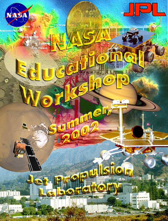 Here is another example, a collage of images from the Jet Propulsion Laboratory in Pasadena created as a cover for a binder of materials for teachers participating in the 2002 NASA Educational Workshops program. I wanted something a bit more colorful and imaginative than the standard boring binder cover. It was created using the same image compositing technique with layer masks.