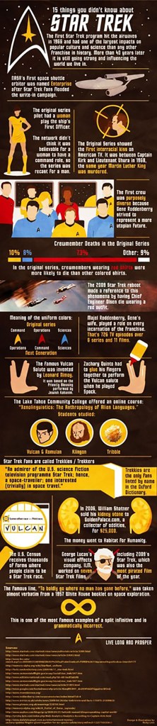 It takes some excellent design skills to think all of this through and to consider how to present different types of data in a visually consistent manner. In the Star Trek infographic shown here (this was not done by myself or a student), the colors are those used in the uniforms for the original series (TOS for you Trekkers out there) and the font is the same one developed for the series. It presents a great deal of data from the percentage of red shirt deaths to the meaning of the uniform colors.