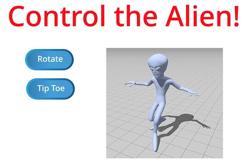 If an animation is created using the rigging and animation features of Adobe Mixamo, you could screen capture individual frames of the animation and stitch them back together in video software or align them as separate layers in Photopea, then save them out again to make separate costumes for Scratch or separate frames for a Wick Editor animation and use buttons to control it by swapping costumes of jumping to the animation frames. An example is this Scratch interface for showing animations of my favorite gray alien as shown here.