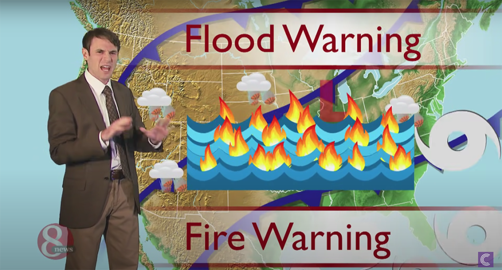 For example, you could do a complete news broadcast on the effects of climate change with eyewitness accounts of disasters, expert interviews, weather reports of storms, droughts, and other climate phenomena, a sports announcer following a football game with a tornado coming, etc. It can be done with humor and a bit of satire but also present important facts and research about the effects of climate change.