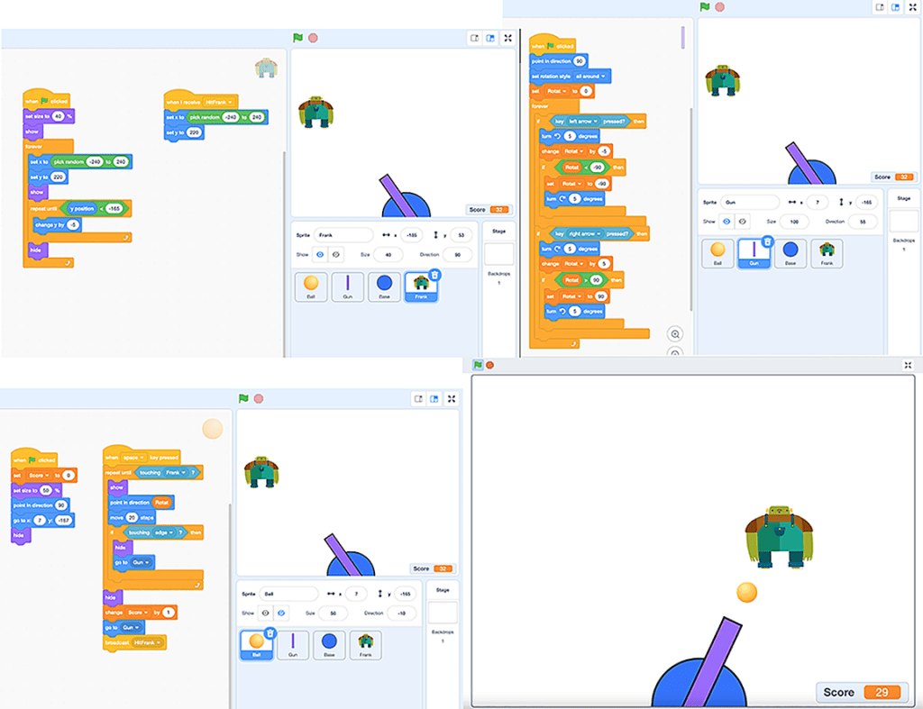 To build this game I simply got one thing at a time working: Frank descending and starting over from a random horizontal position, the cannon rotating, the ball firing, the sprites detecting a collision, the score going up by one. If something doesn’t work, or works unexpectedly, you need to put yourself in the position of the computer, which cannot think or read your mind. It can only do what you tell it to do through code.