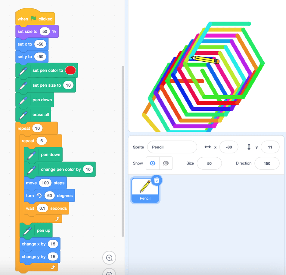 Scratch can also do draw commands, so you can control how the pen moves, its color, width, speed, and so forth using scripting. I had an advanced student once create a Spirograph program in Scratch using curve formulas for the pen tool. Here are two examples of much more simple drawing programs, the first using arrow commands and a variable slider, the second drawing automatic hexagons in a loop that is offset each time through, but also uses a Change Color brick to step through colors 10 values at a time.