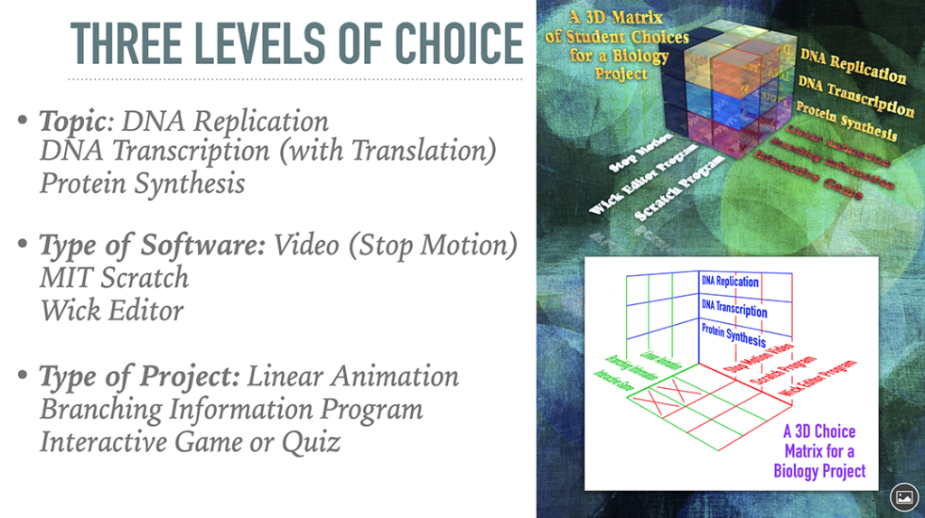 Biology DNA Animations: For biology, which has eighth grade students, I have constrained the choices a bit more and provided additional structure. Their project will be to choose one of three topics: DNA replication, DNA transcription and translation, and protein synthesis. Then they have a choice of three software packages (Wick Editor, Scratch, or stop motion animation with video software) and a choice of three types of projects: a linear animation, an informational branching program, or an interactive game or quiz. Since stop motion animation can only produce a linear video and not a branching program or interactive game, the possible permutations are 21 combinations, which should be plenty for that age of student.