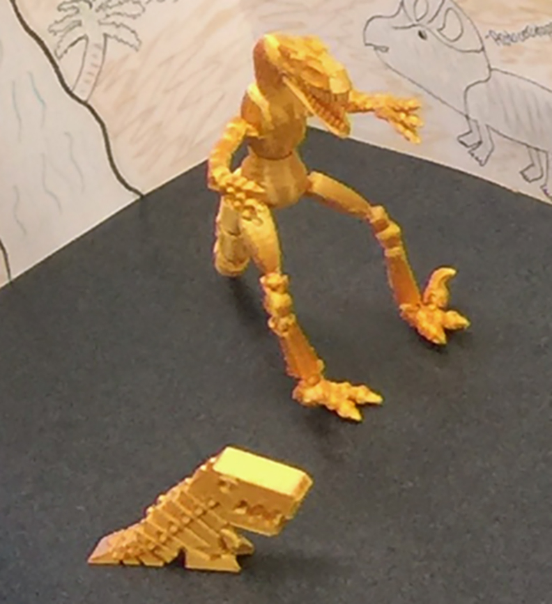 Another possibility for using 3D printed models is to design them to be posable, such as the raptor model shown at right. I found it inside Tinkercad, took all the parts and laid them out in one file so that none of the parts were touching, then saved out the complete file as a single OBJ. Inside my 3D printer, I could then resize the entire file and all the parts would grow or shrink together so that they would still fit. Each part has a ball and socket shape that allows the joints to be moved and posed. You could print out several copies at the same size using different colors of plastic, then mix and match the parts.
