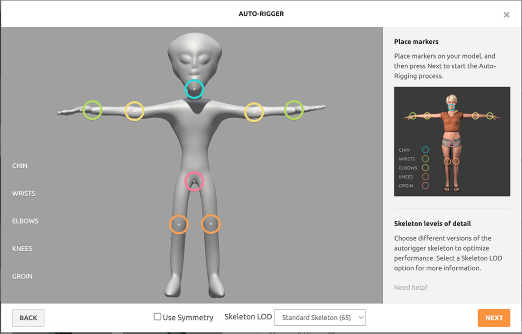 Once you have imported your model into Mixamo, you can create the rigging in a matter of a minute or two. You place markers on your model at the chin, elbows, wrists, knees, and groin and the program will automatically create a rig of 65 bones, complete with weighting and bone names. Once the process is complete, you can export the T-posed and rigged character as an FBX file and use it in 3D animation programs such as Blender or commercial software such as Maya or 3D Studio Max.