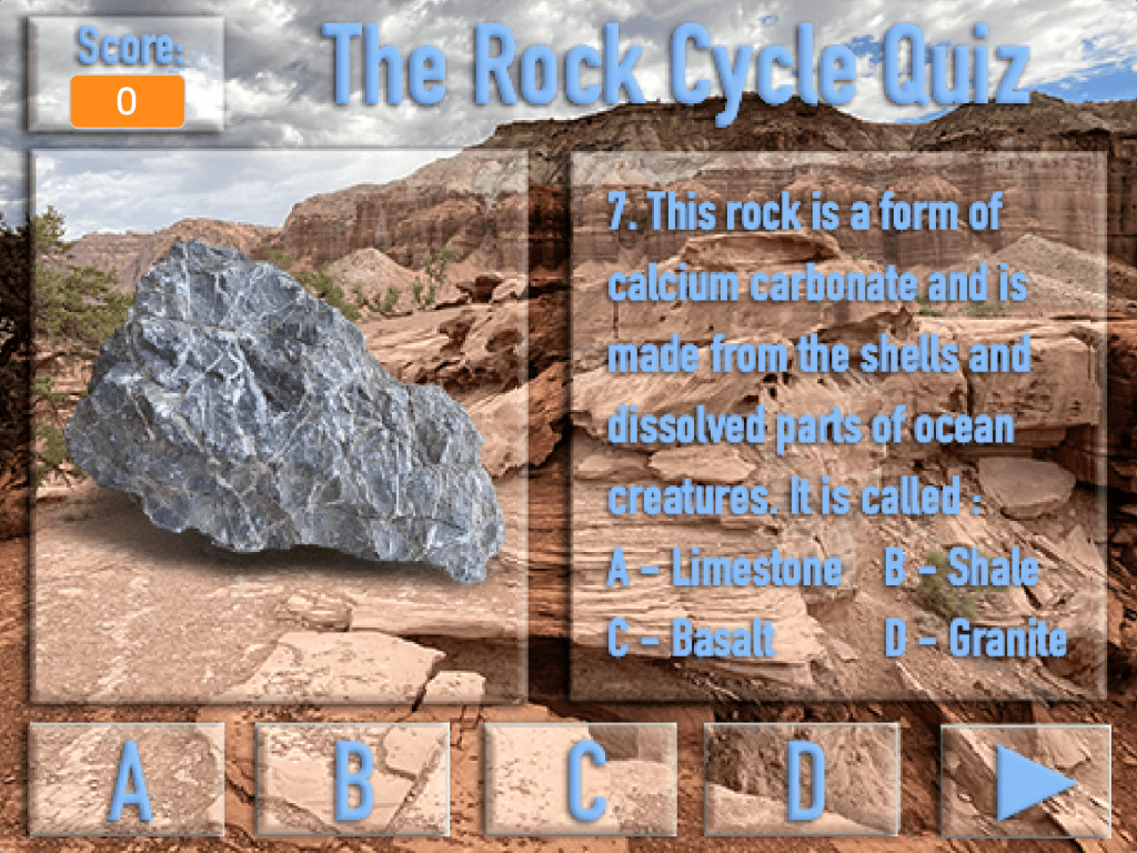 Here is another example of a quiz on different types of rocks. I demonstrated how to design this using Photopea or Adobe Photoshop in the video, including how to make the background, the buttons, the questions, and so on. Each button has three costumes that respond to mouse events. When the mouse is touching the sprite, the costume switches to an Over version. If it rolls back out, it switches back to the Up state. If both the mouse is in the sprite and the mouse is pressed down (the And Boolean operator requires both to be true), the button changes costumes to the Down version. Then on releasing the mouse, a bunch of sequential if-then statements compare a randomly chosen question’s correct answer with the number of the button and if they match, it adds one to the score and picks another question.