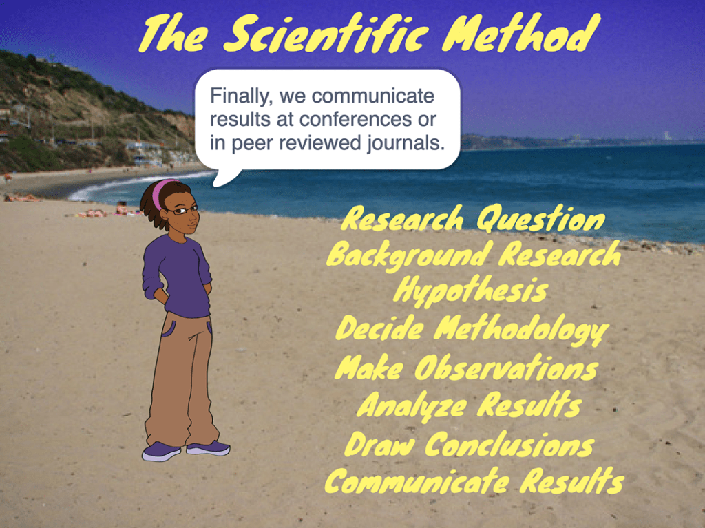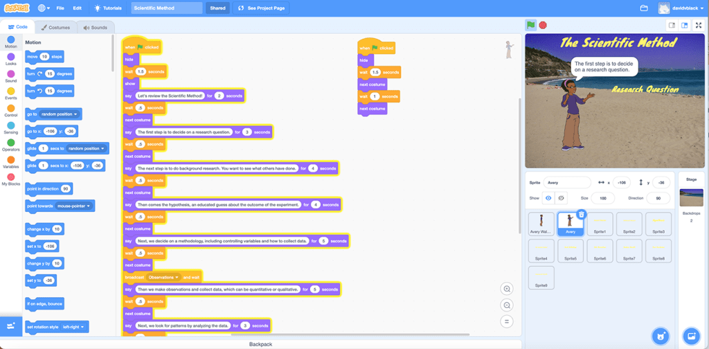 Let’s begin with linear animations. My Scratch Video 1 explains how to set up and control two sprites that are timed to move around the stage and apparently carry on a conversation with speech balloons appearing at carefully timed intervals, as shown in the blocks of code at left. The costumes of a sprite can be swapped in a loop to make the sprite appear to walk (what we call a walk cycle) as it glides across the stage. Sprites can be flipped, resized, hidden and shown, and their opacity changed. In this example of a linear animation, a sprite walks into the stage from the left, pauses but has occasional gestures, and speaks about the steps of the scientific method while text appears on the stage timed for each step.