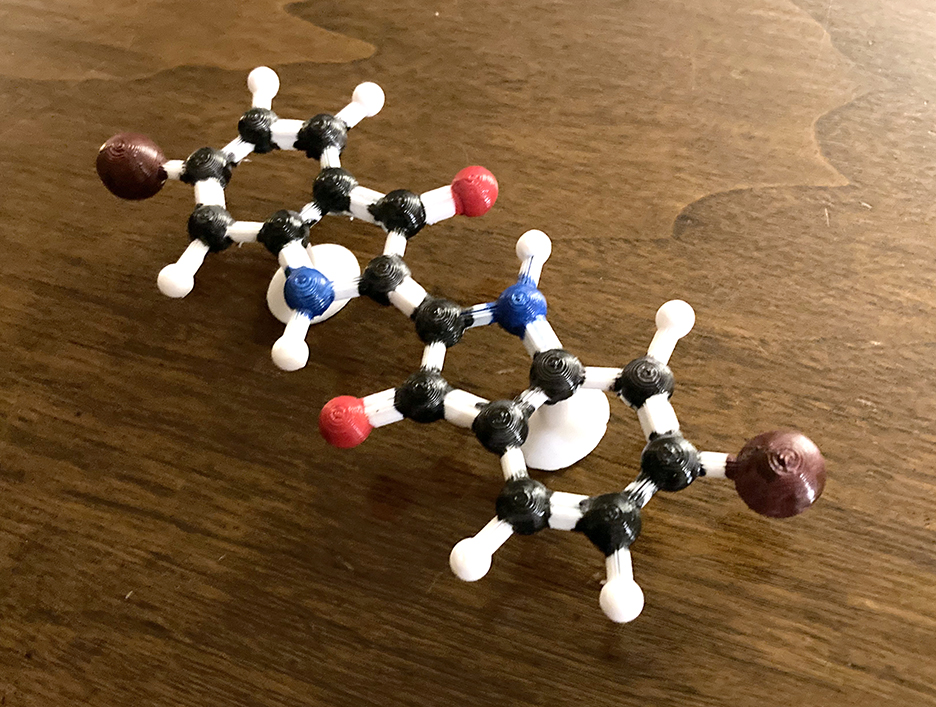 Many other types of object-based learning projects can be created. Students in a chemistry class can pick their favorite molecules, design them in Tinkercad (such as the Tyrian purple molecule shown here), add bases so they will stand up, print them out, and paint them. Students can create display cards on the molecules’ historical significance, structure, properties, and uses.